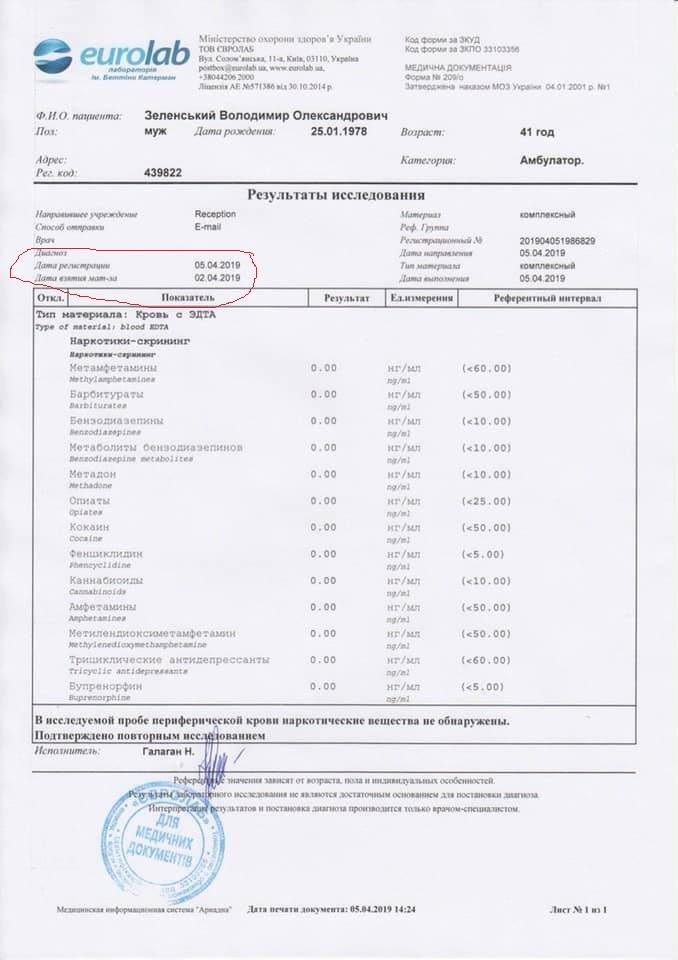 Кандидат в президенты Владимир Зеленский опубликовал в сети результаты анализа крови на алкоголь и наркотики, который он сдал сегодня утром.