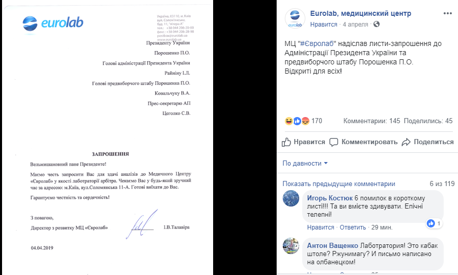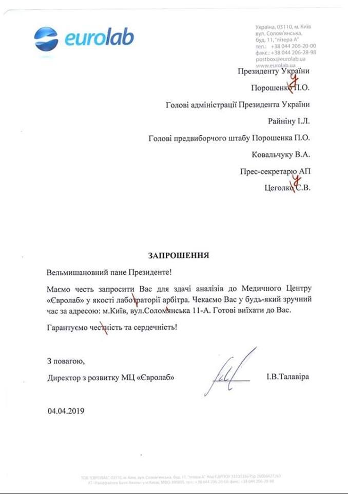 Медицинский центр Eurolab, в котором вчера кандидат в президенты Владимир Зеленский сдал анализ крови на наркотики, направила приглашение Петру Порошенко также провести исследование.