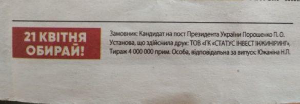 Помимо билбордов, с таким же изображением агитационные палатки Порошенко начали распространять газеты.