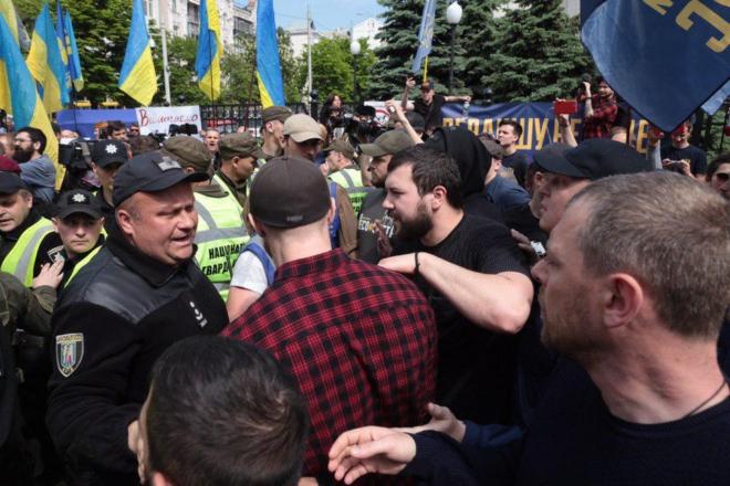 Сейчас активистов разделяют кордоны Нацгвардии и сотрудников Нацполиции. Информации о пострадавших в результате происшествия пока нет.