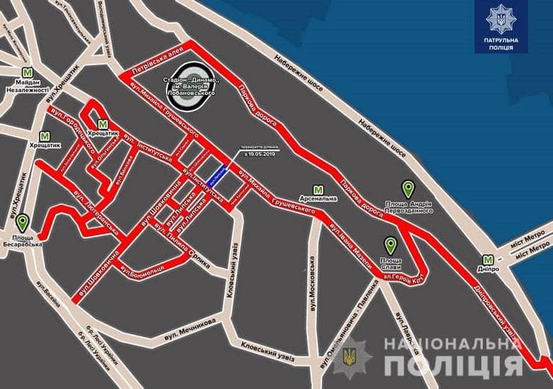 Он также приложил к посту обнародованную полицией схему улиц, которые будут перекрыты в понедельник в Киеве.