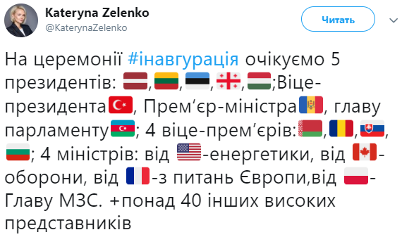 Так, на инаугурацию Зеленского приедут 5 президентов: Латвии - Раймондс Вейонис, Литвы - Даля Грибаускайте, Эстонии - Керсти Кальюлайд, Грузии - Саломе Зурабишвили и Венгрии - Янош Адер.
