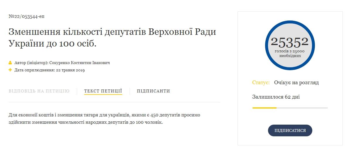 Петиция об уменьшении количества депутатов Верховной Рады Украины до 100 человек набрала необходимое для рассмотрения количество голосов – 25 тысяч.