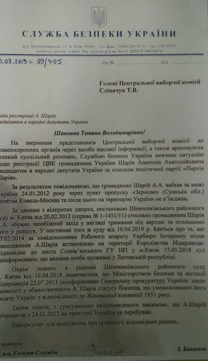 По многочисленным запросам, Служба безопасности Украины провела проверку информации о месте пребывания в течение последних пяти лет Андрея Клюева и Анатолия Шария, которых ЦИК зарегистрировала кандидатами в народные депутаты. Из документов следует, что указанные лица не находились на территории Украины последние 5 лет.