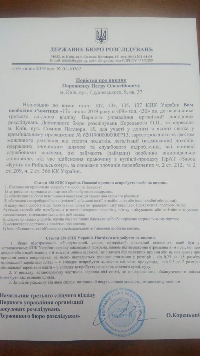 Согласно копии документа, экс-президента просят явиться в 9:30 к начальнику третьего отдела 1-го управления организации досудебных расследований Государственного бюро расследований Олегу Корецкому, передает Час Пик.