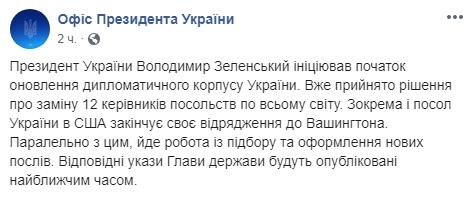 У Зеленского отметили, что посла Украины в США также планируют заменить другой кандидатурой. В настоящее время ведется работа по подбору и оформлению новых украинских руководителей посольств.