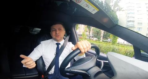 Судя по пейзажу за окном авто, Зеленский двигался на электрокаре "Tesla" по бульвару Леси Украинки.