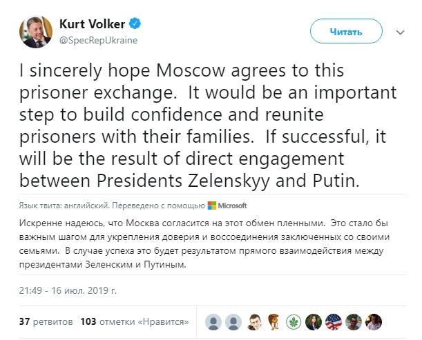 "Я искренне надеюсь, что Москва согласится на этот обмен пленными. Это было бы важным шагом для укрепления доверия и воссоединения заключенных с их семьями. В случае успеха это будет результатом прямого взаимодействия президентов Зеленского и Путина", - пишет специальный представитель Государственного департамента США по вопросам Украины Курт Волкер.