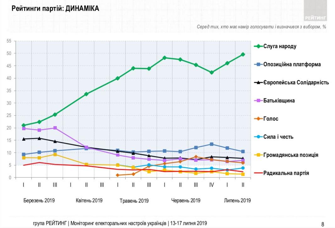 Лидером электоральных симпатий среди политических сил остается партия «Слуга народа», которую готовы поддержать 49,5% тех, кто намерен голосовать и определился с симпатиями.