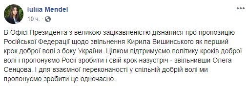 "В Офисе Президента с большим интересом узнали о предложении Российской Федерации об освобождении Кирилла Вышинского как первом шаге доброй воли со стороны Украины. Полностью поддерживаем политику шагов доброй воли и предлагаем России сделать и свой шаг навстречу - освободив Олега Сенцова. И для взаимной уверенности в общей доброй воле мы предлагаем сделать это одновременно", - написала Мендель в Фейсбуке.