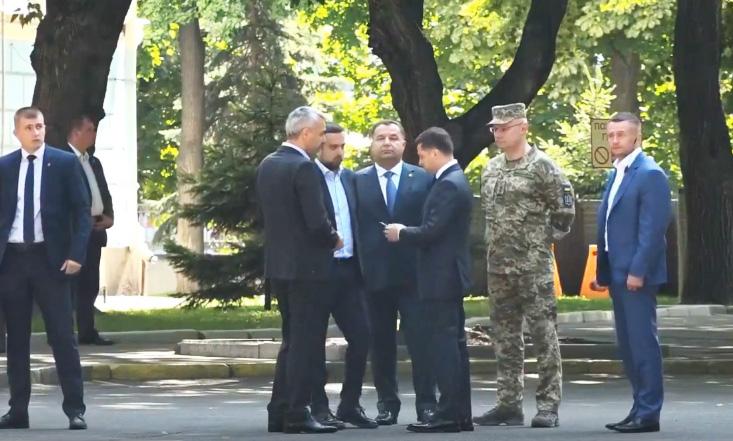 На кадрах видно, как Владимир Зеленский вышел из машины и стал беседовать с начальником Генерального штаба Русланом Хомчаком, заместителем председателя Офиса президента Русланом Рябошапкой и еще одним мужчиной.
