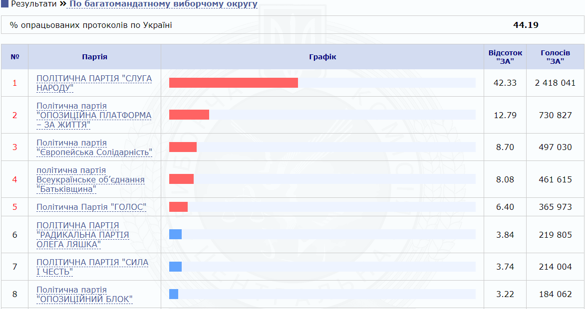Отметим, что по промежуточным результатам подсчета голосов в Украине, тройка лидеров выглядит иначе: "Слуга народа" вырывается далеко вперед с 42% голосов, "Европейская Солидарность" набирает только 8,7%.