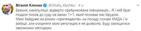Мне все равно на разных «претендентов» на должность главы КГГА и их амбиции, но очернять мою репутацию я не позволю. Буду защищаться законными методами", - отметил Кличко.
