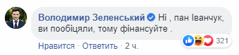 В комментариях вскоре отметился Зеленский. "Нет, господин Иванчук, вы пообещали, поэтому финансируйте", - заявил он.