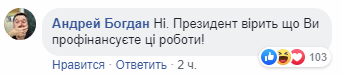 Отписался под публикацией и глава Офиса президента Андрей Богдан. "Нет. Президент верит что Вы профинансируете эти работы!" - написал он в комментарии.