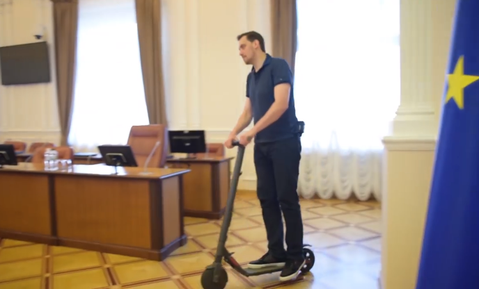 Премьер отметил, что в правительственном здании множество этажей и кабинетов, а коридоры такие длинные, что иногда можно пользоваться самокатом. Что Гончарук и сделал.