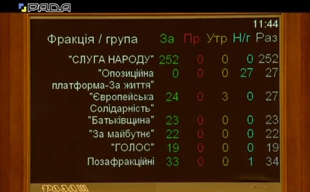 Не голосовала за исторический закон фракция "Оппозиционная платформа - За жизнь" в полном составе и один внефракционный депутат. Трое членов "Европейской солидарности" воздержались.