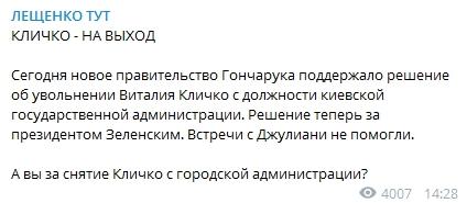 Об увольнении Кличко сообщил в Telegram-канале бывший народный депутат Сергей Лещенко, а также нардеп от "Европейской солидарнорсти" Алексей Гончаренко в Facebook.