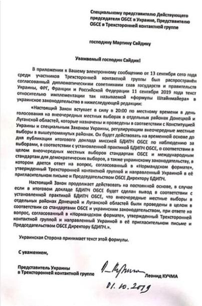 Обнародован текст документа, закрепляющего "формулу Штайнмеайера", который был подписан 1 октября на заседании Трехсторонней контактной группы. Со стороны Украины этот документ был подписан Леонидом Кучмой, передает Час Пик со ссылкой на украинские СМИ.