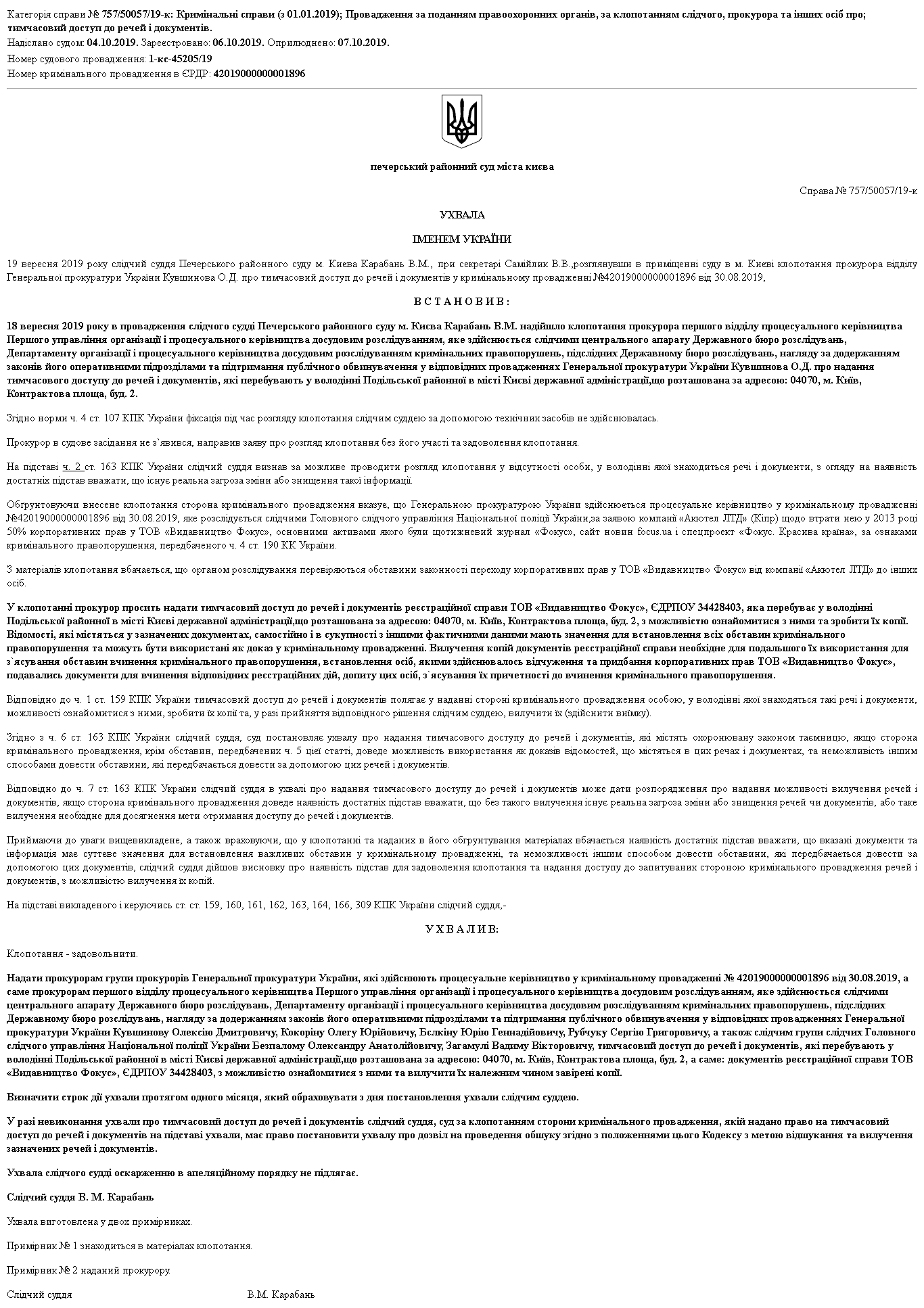 Своим решением суд удовлетворил ходатайство прокурора Генпрокуратуры о предоставлении доступа к документам регистрационного дела "Издательства Фокус".