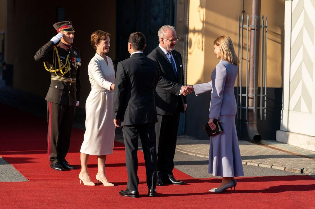 Официальная церемония встречи с Эгилсом Левитсом состоялась у Рижского замка – резиденции Президента Латвийской Республики. Главы государств провели смотр строя роты почетного караула. Прозвучали государственные гимны Украины и Латвийской Республики.