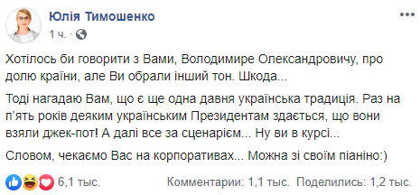 После нелесного выпада Зеленского в адрес Тимошенко, на Фейсбук-странице последней появился ответ, передает Час Пик.