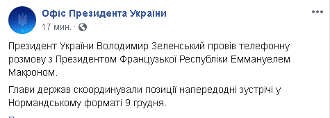 "Главы государств скоординировали позиции накануне встречи в Нормандском формате 9 декабря", - говорится в сообщении.