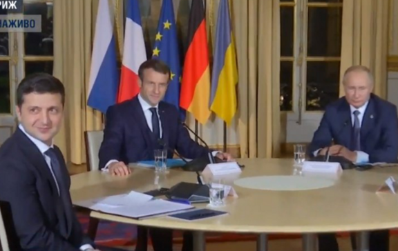 За столом переговоров впервые встретились президент Украины Владимир Зеленский и президент России Владимир Путин, также в переговорах участвуют канцлер Германии Ангела Меркель и президент Франции Эммануэль Макрон.