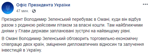 "Президент Владимир Зеленский находится в Омане, куда он отбыл вместе с семьей рейсовым самолетом за собственные средства. Там в ближайшие дни у главы государства запланированы встречи на высшем уровне.
