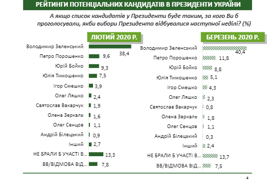 Владимир Зеленский остается политиком с самым высоким электоральным рейтингом. Если бы выборы президента состоялись в ближайшее воскресенье, за него проголосовали бы 40,4% респондентов (в феврале нынешнего президента поддерживали 38,4% украинцев).