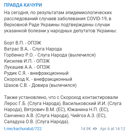 По его информации, коронавирусом заразились депутаты от ОПЗЖ Виталий Борт и Игорь Кисилев.