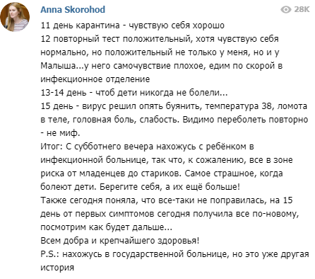 Примерно через 10 дней Скороход уже чувствовала себя хорошо, хотя тест на коронавирус был положительным. Однако на 15-й день с начала болезни снова появились симптомы - температура 38, ломота в теле, головная боль, слабость.