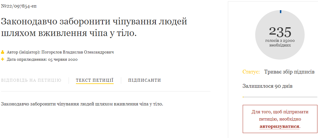 "Законодательно запретить чипирование людей путем внедрения чипа в тело", - говорится в тексте петиции.