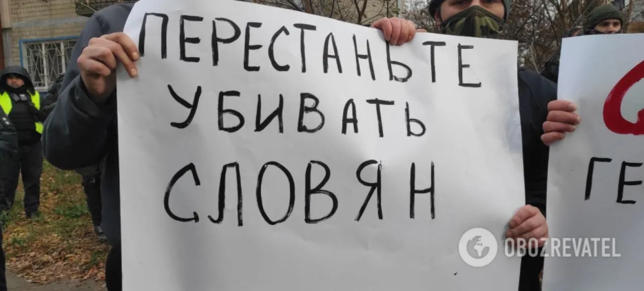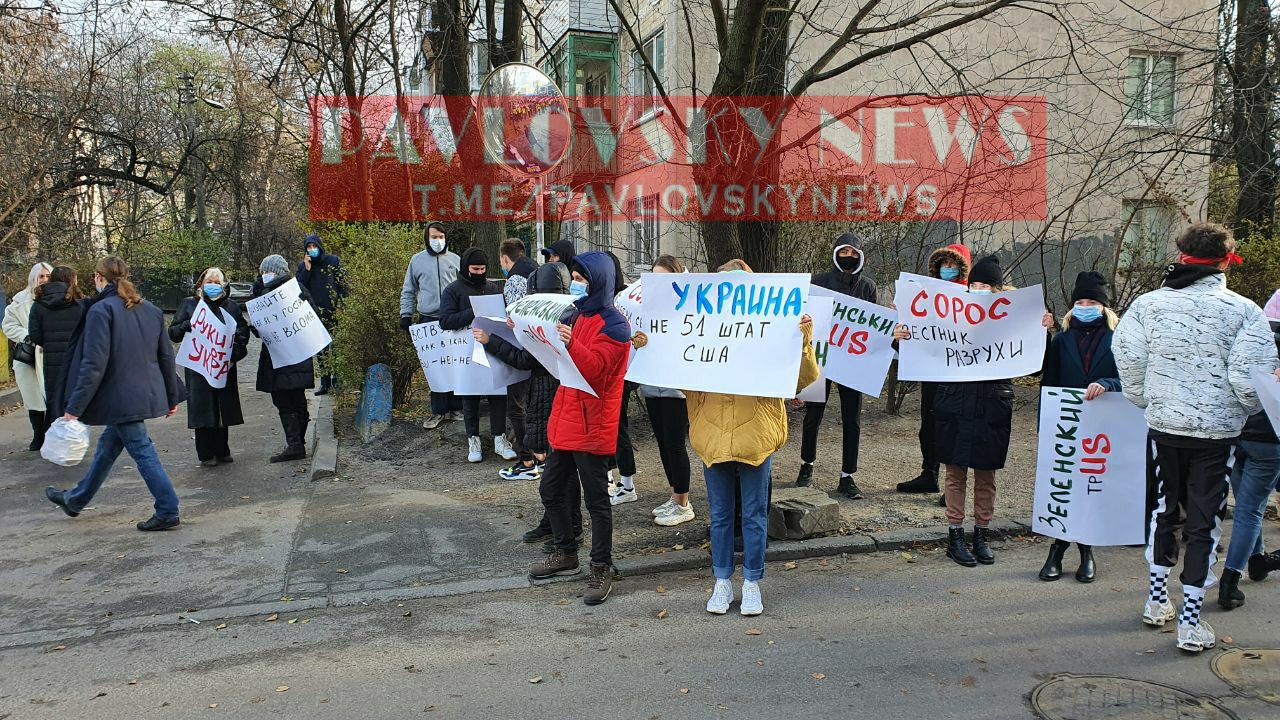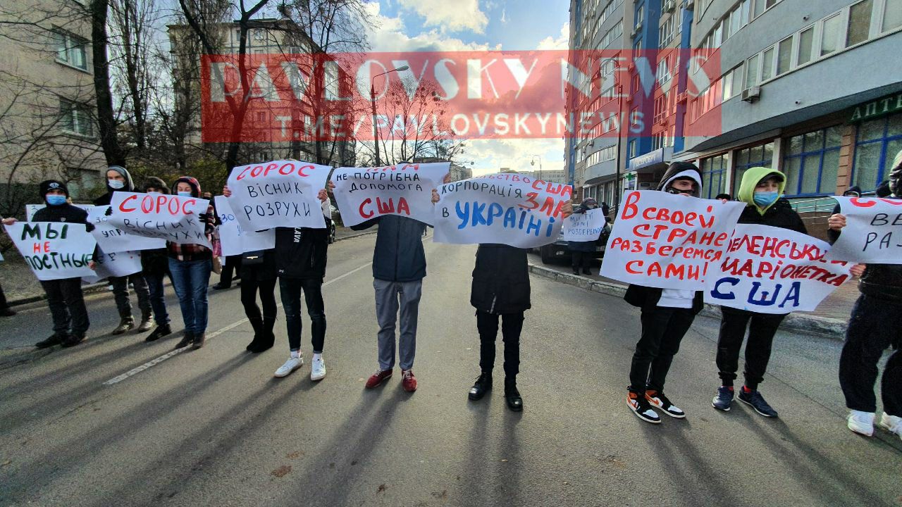 Митингующие держали плакаты "Украина - не 51 штат США", "США сокращает количество славян", "Прекратите эксперименты над украинцами" и т.п.