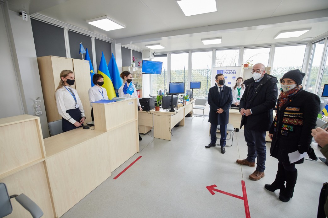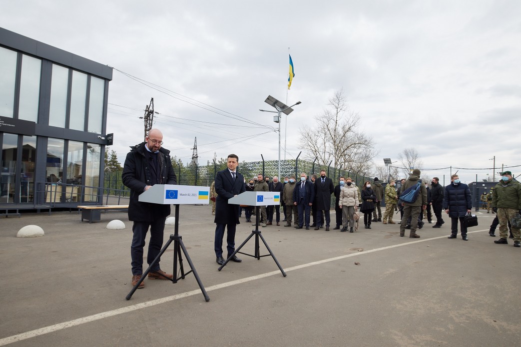 Президент Украины Владимир Зеленский и президент Европейского совета Шарль Мишель осмотрели Центр предоставления административных услуг (ЦПАУ) на контрольном пункте въезда-выезда (КПВВ) «Счастье» в Луганской области.