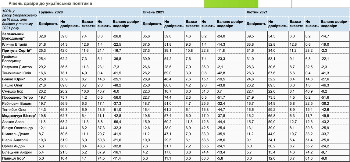 Вместе с тем, по уровню доверия Зеленский снова вышел на первое место, если верить данным КМИС. В январе он уступал Виталию Кличко , сейчас же ему доверяют 32,8% опрошенных, не доверяют - 59,6%. Виталию Кличко, в свою очередь, доверяют 31,8%, не доверяют - 54,3%. На третье место вышел Сергей Притула: ему доверяет 25,3% украинцев, не доверяет - 42%.