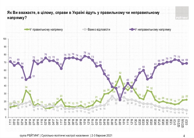 Результаты опроса Социологической группы "Рейтинг" свидетельствуют о том, что большая часть украинцев считает путь страны не верным. Так, 69% граждан считают, что страна движется в неправильном направлении, 22% - в правильном. 9% - не определились.