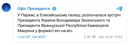 "В Париже, в Елисейском дворце, началась встреча президента Украины Владимира Зеленского и президента Французской Республики Эммануэля Макрона в формате один на один", - сообщили у Зеленского.