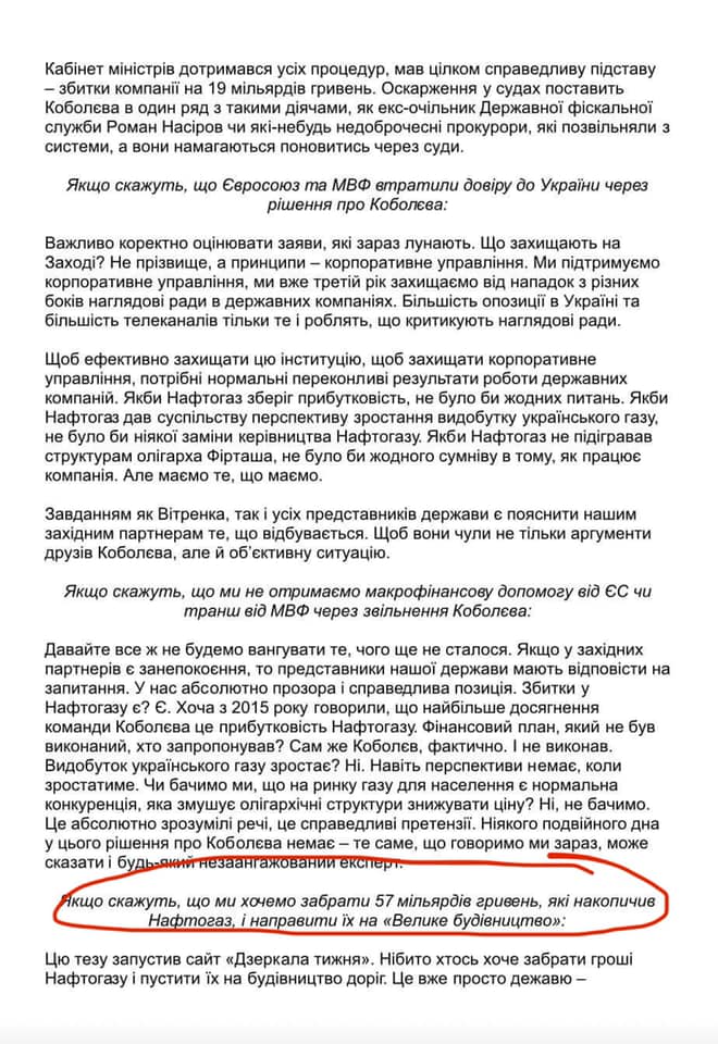 "Андрея Коболева уволили в первую очередь из-за отказа дать деньги "Нафтогаза" (речь идёт о 2 млрд долларов) на коррупционную пилораму Зеленского-Ермака-Тимошенко "Велике будівництво". Это следует из перехваченного темника, который находится в распоряжении "Зеркала недели". Хороший поворот", - написал Березовец.