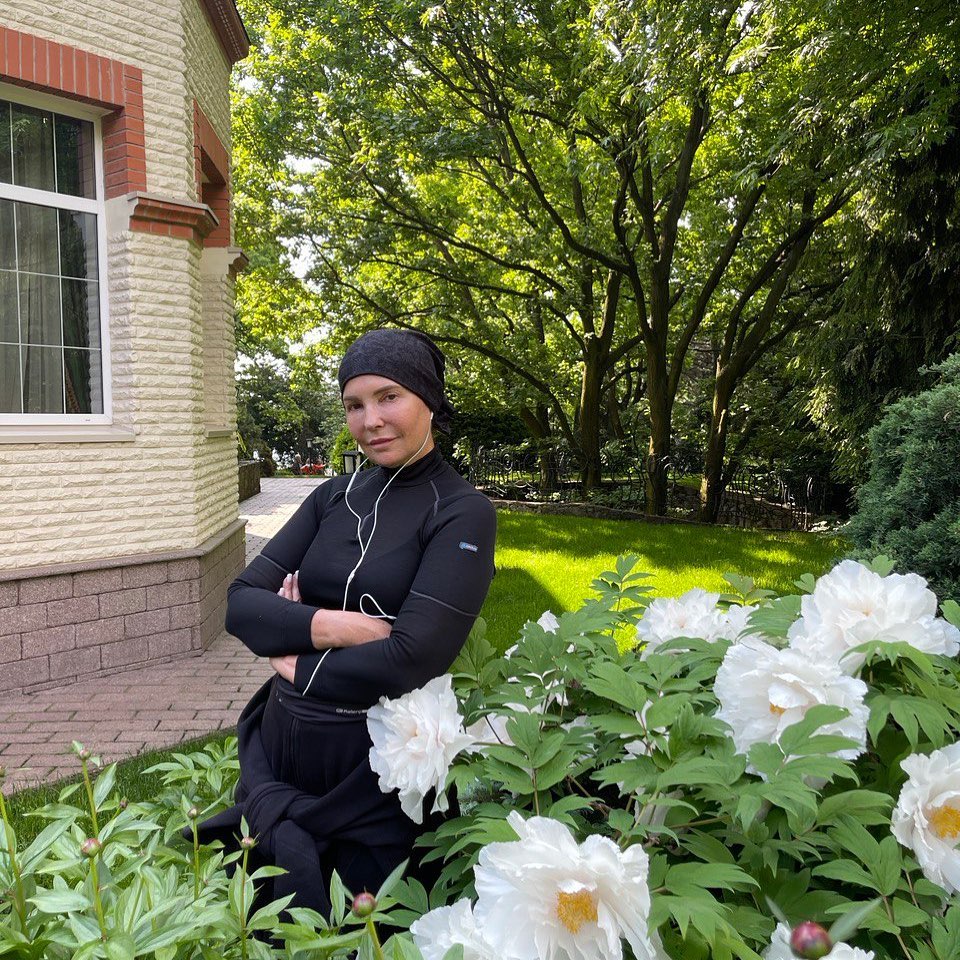 На фото она запечатлена в черном спортивном костюме, бандане и с наушниками - вероятно, в таком виде Тимошенко отправилась на пробежку. Снимок был сделан на заднем дворе дома Тимошенко, возле цветущих пионов.