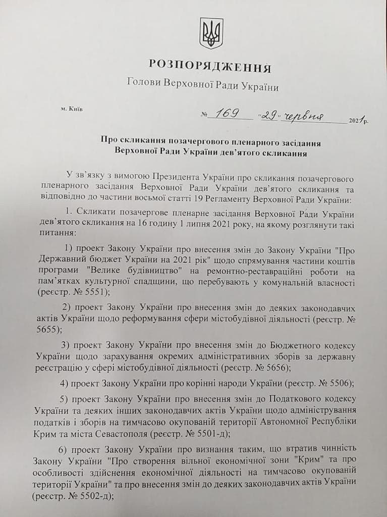 Он обнародовал соответствующее распоряжение спикера парламента Дмитрия Разумкова.