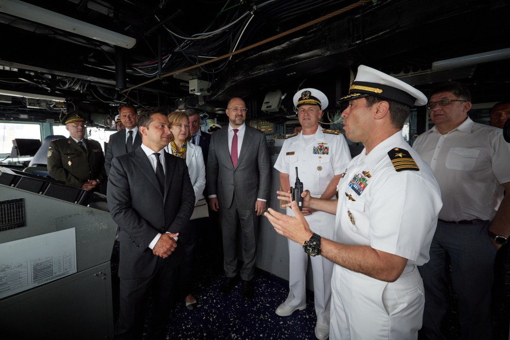 Во время рабочей поездки в Одесскую область Президент Украины Владимир Зеленский посетил эсминец «Росс» Военно-Морских Сил США, который участвует в международных военно-морских учениях «Си Бриз - 2021».