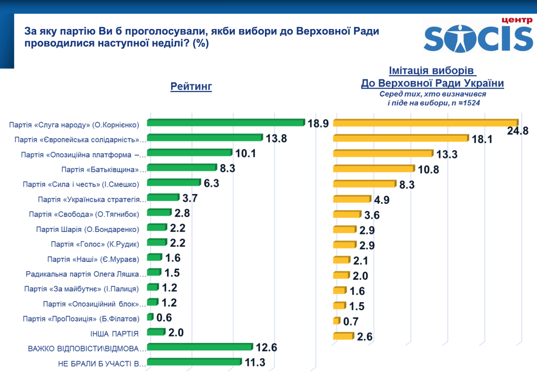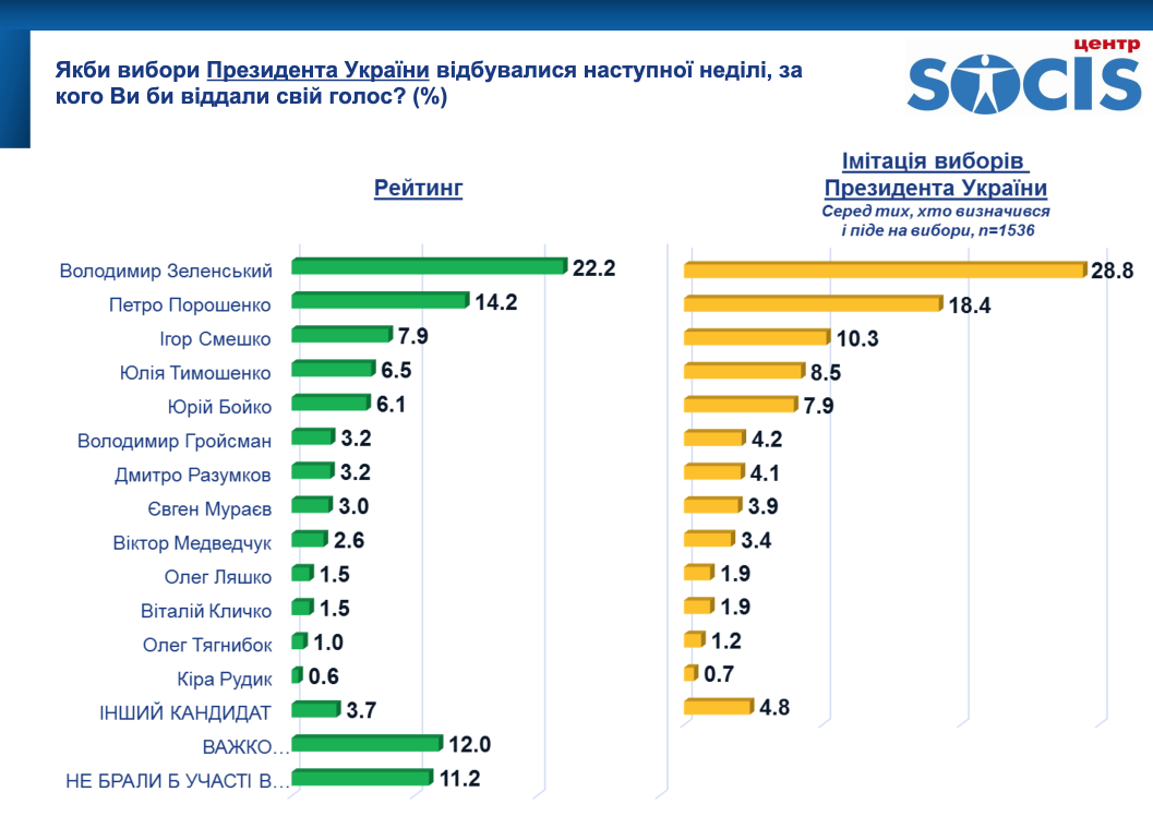Опрос показал, что Зеленский лидирует в президентском рейтинге - за него готовы отдать голоса 28,8% респондентов, если бы выборы состоялись сегодня. На втором месте лидер "Европейской солидарности" Петр Порошенко - 18,4%, на третьем Игорь Смешко ("Сила и честь") - 10,3%, на четвертом - Юлия Тимошенко ("Батькивщина") - 8,5%. Замыкает пятерку Юрий Бойко ("Оппозиционная платформа - За жизнь") - 7,9%.