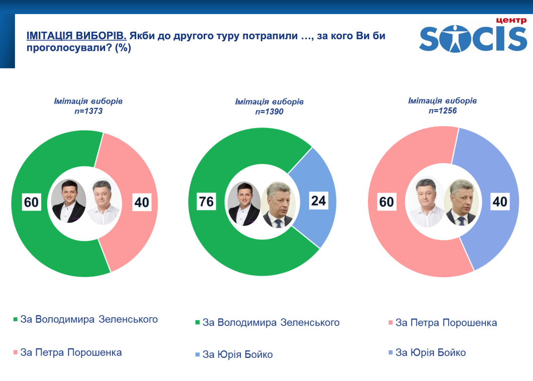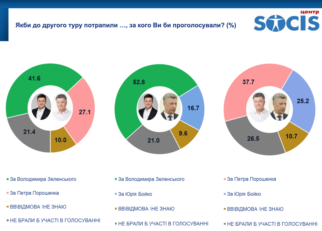 Вместе с тем, если бы во второй тур попали Зеленский, Порошенко и Бойко, у действующего президента, вероятно, было бы больше шансов на победу, чем у других претендентов.