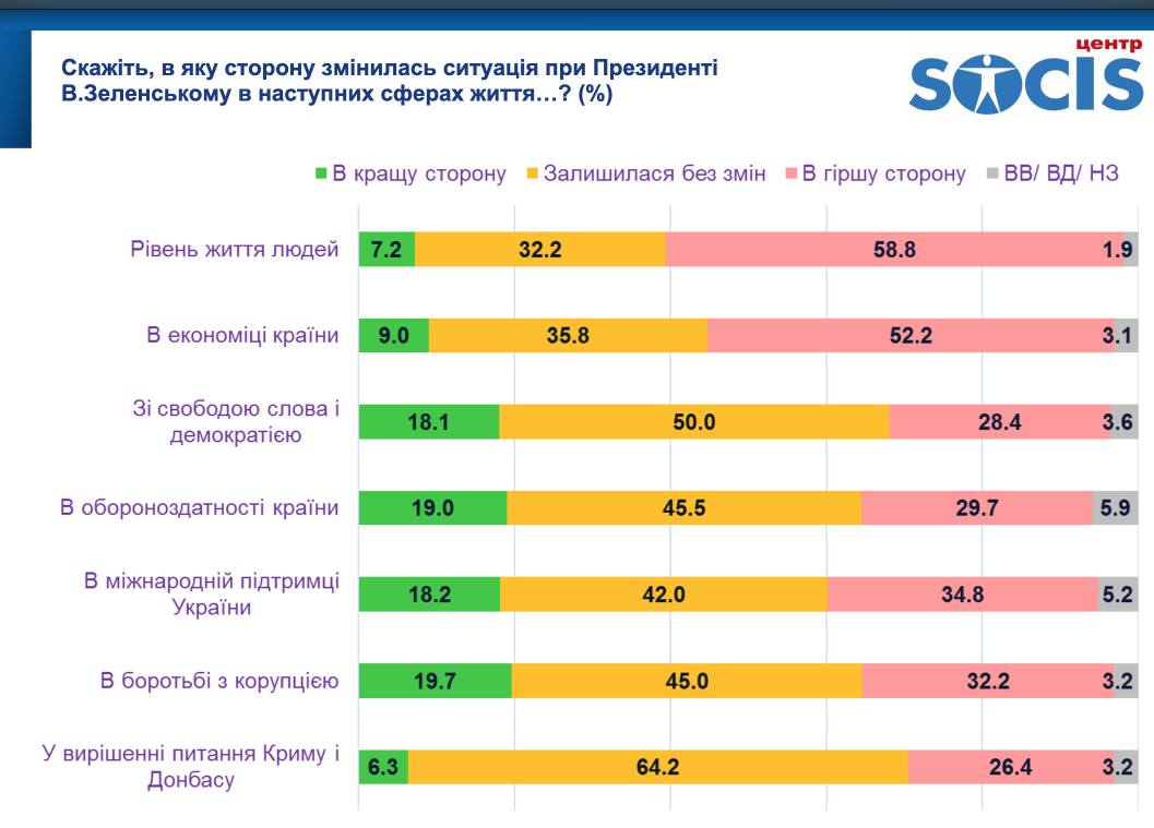 Только 7,2% респондентов считают, что за время президентства Зеленского уровень жизни улучшился, 58,8% уверены в обратном. Также большинство опрошенных (52,2%) считают, что экономическая ситуация ухудшилась.