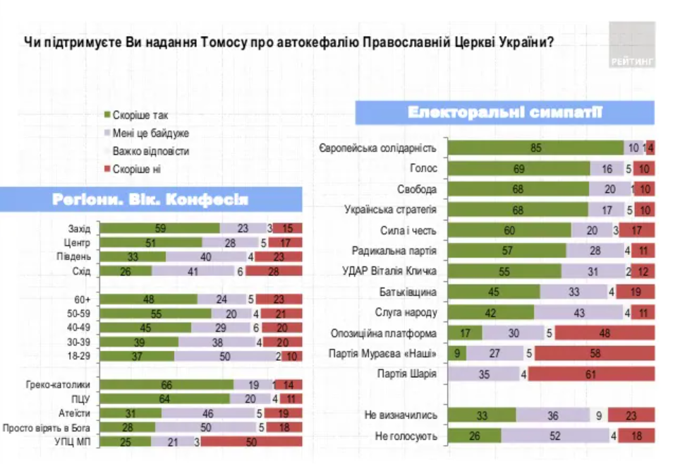 Наибольшая поддержка предоставления Томоса среди жителей Запада и Центра, людей старшего возраста, а также тех, кто относит себя к греко-католикам и ПЦУ. Наибольшая поддержка Томоса - среди избирателей "Европейской Солидарности". Негативно относятся к предоставлению Томоса сторонники "ОПЗЖ", партий Мураева и Шария.