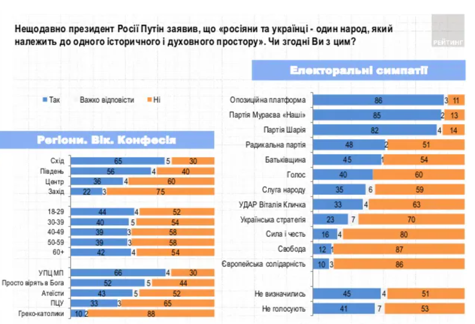 На Востоке, а также среди прихожан УПЦ МП с таким мнением согласны более 60%. Среди жителей Западного региона, наоборот, более 70% не согласны с этим. Более 80% избирателей "ОПЗЖ", партий Мураева и Шария соглашаются с тезисом про «один народ».