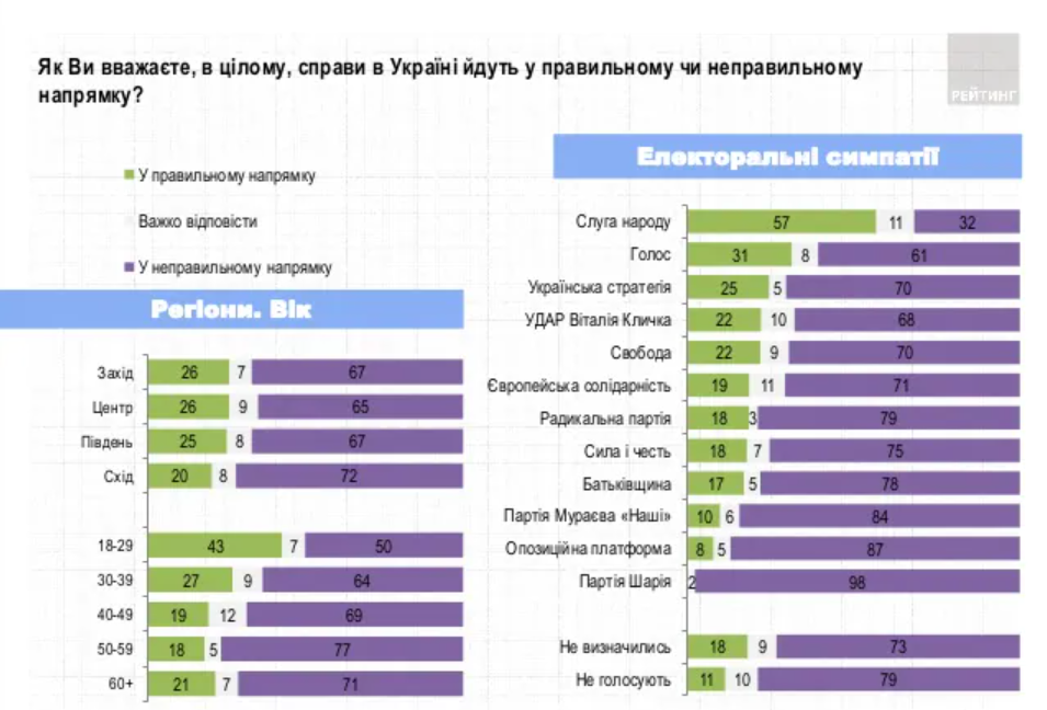 Направление развития Украины как правильное оценивают большинство сторонников партии "Слуга народа". Больше всего тех, кто считает движение Украины неправильным, среди сторонников "Партии Шария", "ОПЗЖ", партии Мураева "Наши".