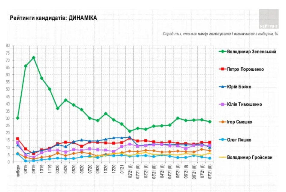 Рейтинг доверия к политикам возглавляет действующий президент Владимир Зеленский, которому доверяют 45% опрошенных, не доверяют - 52%. Юлии Тимошенко доверяют 31%, не доверяют - 68%. Юрию Бойко доверяют 25%, не доверяют - 57%. Петру Порошенко доверяют 26%, не доверяют - 72%. Виктору Медведчуку доверяют 18%, не доверяют - 70%. Денису Шмыгалю доверяют 16%, не доверяют - 51%, не слышали о таком - 28%.