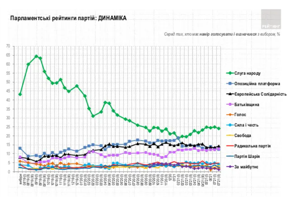 Если бы парламентские выборы проходили сейчас, партию «Слуга народа», поддержали бы 24,1% среди тех, кто будет голосовать и определился с выбором. За партию «Европейская солидарность» проголосовали бы 14,3%, "Батькивщина" - 12,8%, «Оппозиционная платформа - За жизнь» - 12,4%. Эти партии гарантированно бы прошли в парламент. Рейтинг других политических сил значительно ниже. Так, партия «Украинская стратегия Гройсмана» на грани 5-процентного барьера - ее готовы поддержать 5,0% опрошенных, Радикальная партия и партия Мураева «Наши» по 4,8%, «УДАР Виталия Кличко» - 4,3% , партию «Сила и честь» - 4,1%, партию «Свобода» - 3,4%. Рейтинг других политических сил - менее 3%.